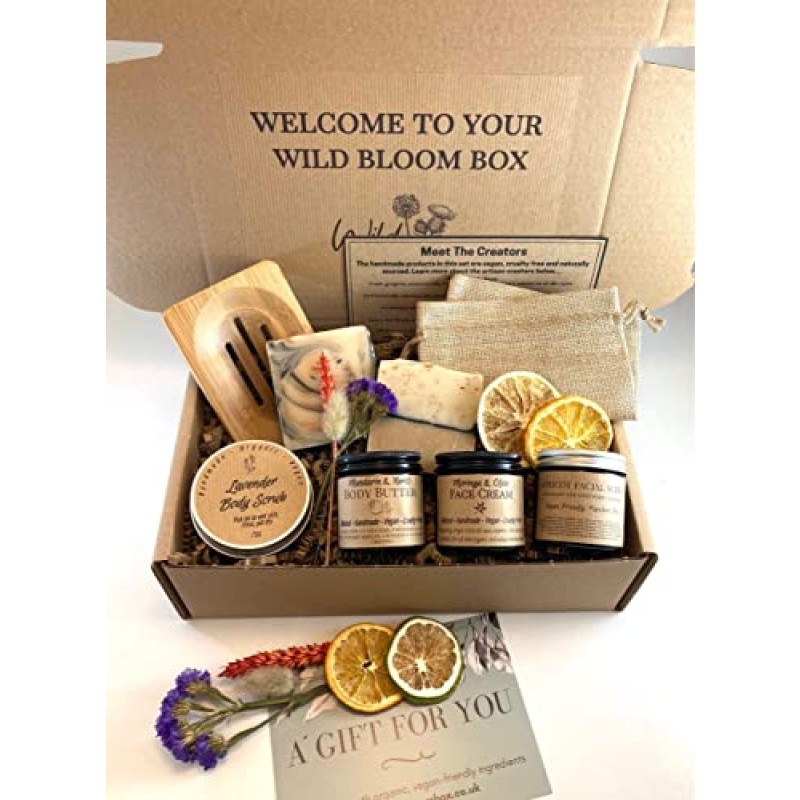 The Handmade Vegan Skincare Spa Box offers a carefully curated collection of eight artisan products, all crafted by UK makers with gentle, nourishing ingredients. This vegan-friendly and cruelty-free set includes moisturising face and body creams, exfoliating scrubs, and soothing soap bars scented with natural essential oils such as mandarin, apricot, lavender, and bergamot. Each item is designed for sensitive skin, promoting natural care and a calming daily routine.