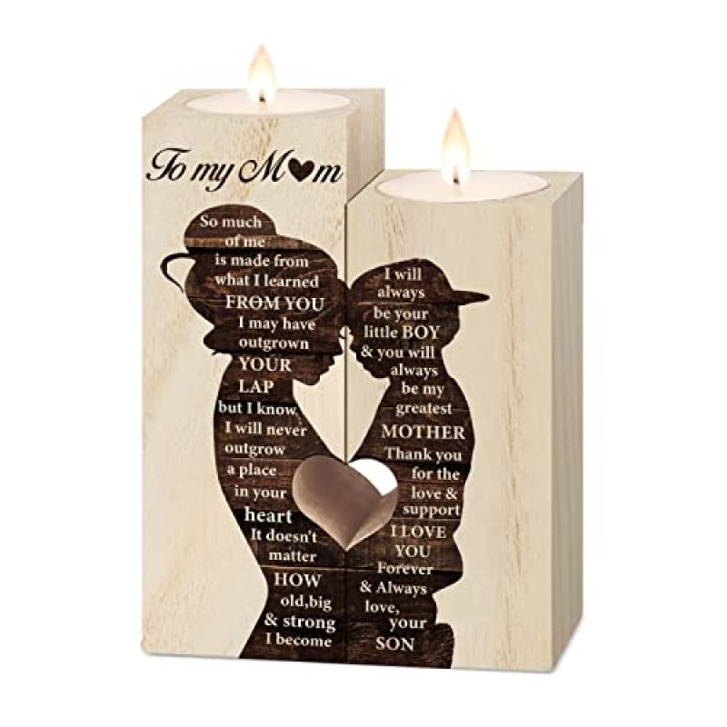 One candlestick is engraved with a heartfelt message that warmly acknowledges a mother's love and lifelong support, while the accompanying imagery of a mother lifting her son highlights their joyful connection. This gift holder is designed to fit comfortably in various home spaces like the bedside table, living room, or bathroom, allowing mum to enjoy this thoughtful reminder of affection and appreciation every day.