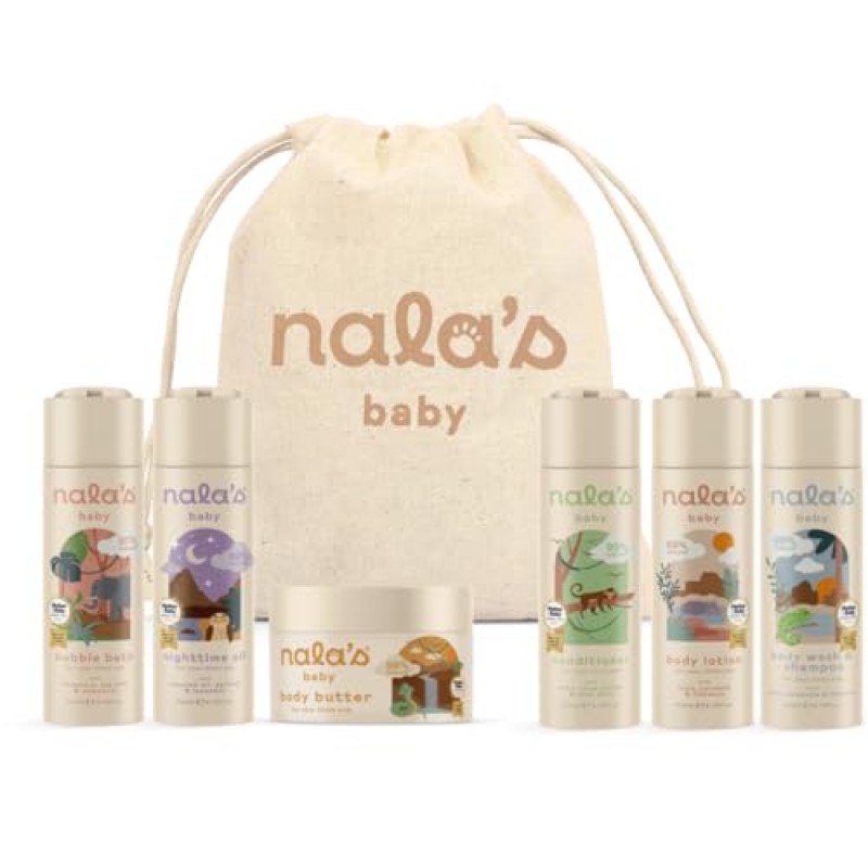 Nala's Baby Adventure Bundle offers a full skin and hair care range designed to meet all your little one's bathing needs with gentle, effective ingredients. This carefully selected set includes body wash & shampoo, body lotion, bubble bath, and nighttime oil, all formulated to soothe and nurture delicate skin. The products are free from sulphates, alcohols, parabens, SLS/SLES, and have received the highest '0' rating on Think Dirty, ensuring pure and safe care. Perfectly mild and clinically proven for newborns and babies with sensitive skin, the bundle helps keep your baby feeling relaxed and squeaky clean. Dermatologically tested and paediatrician approved, this vegan and cruelty-free range supports both your baby’s wellbeing and ethical values. Additionally, the set comes with a soft, 100% cotton drawstring toiletry bag, perfect for keeping all essentials organised whether at home or on the go. The gentle coconut-based scent adds a comforting touch without overwhelming sensitive noses, making bath time soothing and enjoyable for both babies and parents alike.